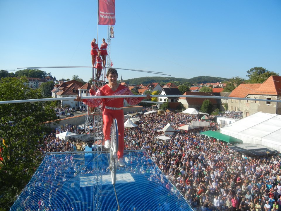 Niet alles gebeurt zo hoog, schreef ik al. Maar stunts met motoren, compleet met wheelies, op 40 meter hoogte zag ik ook nog nooit! En rijden met een raceauto, op twee draden uiteraard, op 30 meter hoogte behoort ook al tot de mogelijkheden!