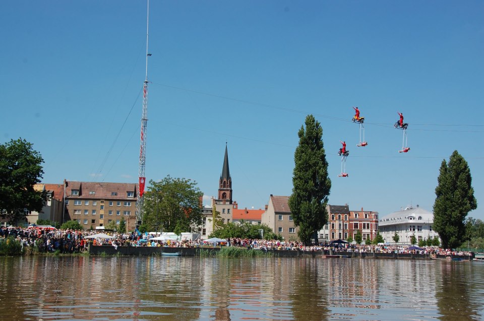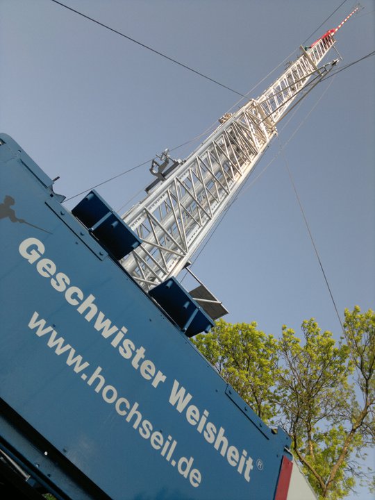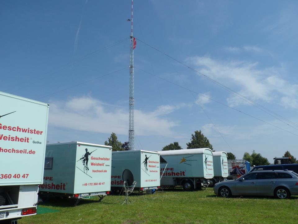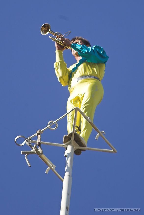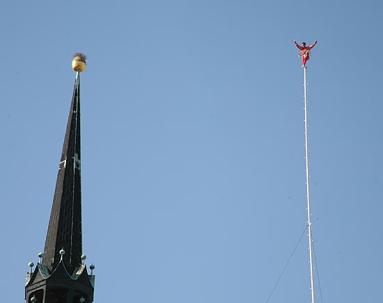 De allerhoogste stunts worden ongezekerd(!) verricht op een mast van 62 meter, en dat is hoger dan de plaatselijke kerktoren!