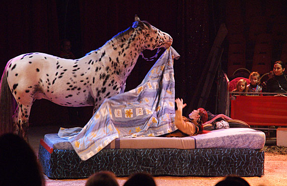 http://www.youtube.com/watch?v=z1qnSC8NG0QEn de tweede, tijdsduur 12.53. Opnieuw een combinatie van dieren en acrobatiek. Dat de jongste telg gezekerd wordt voor hij omhoog gaat vindt hij vast niet leuk...