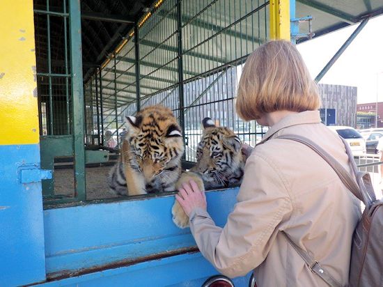 Een voorbeeldje? Nou, wanneer je naar bovenstaande foto kijkt is het dus geen stofdoek ofzo die mevrouw in haar linkerhand heeft, maar een poot van het jonge tijgertje, wat het spontaan gaf!