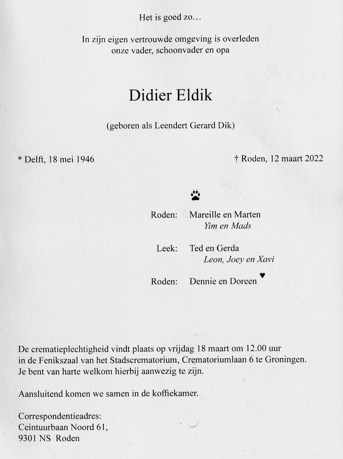 We misten Didier al meer dan een week, en konden hem ook niet bereiken. Vandaag kreeg ik de rouwkaart binnen. Ik vreesde al het ergste, want Didier kwakkelde met zijn gezondheid al klaagde hij daar nooit over.
