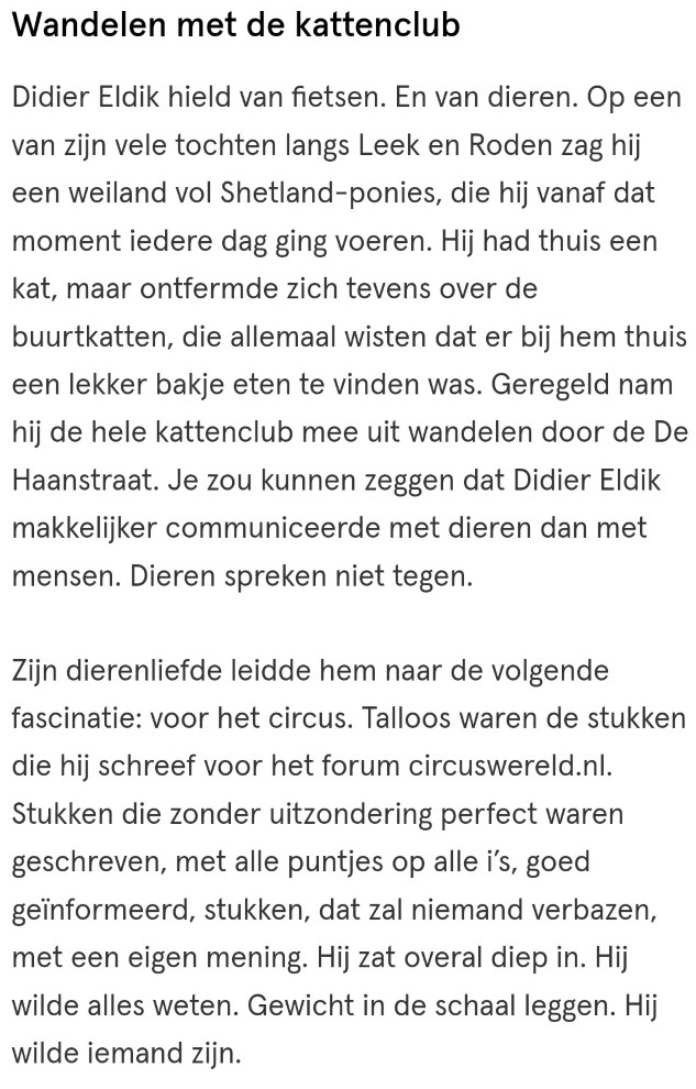 Didier begon hier 10 jaar geleden anoniem als "circusmeisje" maar ging later onder zijn eigen naam hier schrijven. Het werd een soort levenswerk voor hem om alles wat met circus te maken heeft aan de grote klok te hangen, vooral circus met dieren had zijn belangstelling.