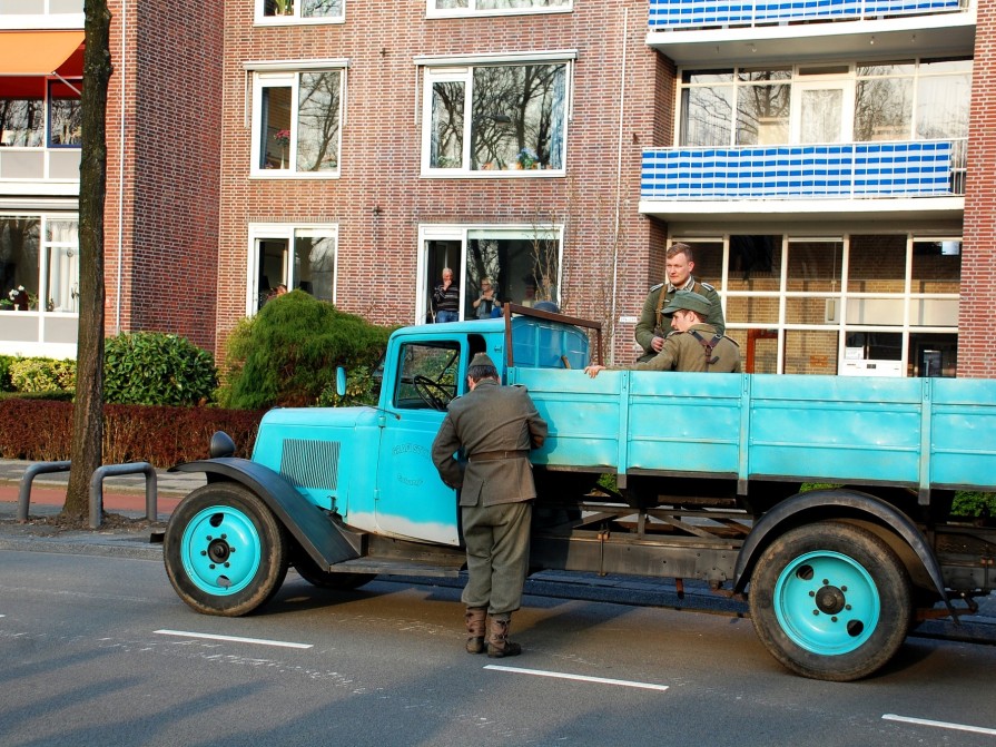 Heel veel verstand heb ik er niet van, maar dit was volgens mij geen Opel Blitz, waarover ze toen veelvuldig beschikten. Hoewel ik die in de loop der jaren onder meer bij filmopnamen nogal eens tegen ben gekomen was men er kennelijk niet in geslaagd er voor deze gelegenheid een op de kop te tikken. Ze zijn er vast nog wel, zeker in Duitsland.