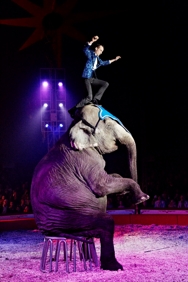 Plaatje van de Zwitser Lars Hölscher met een van zijn olifanten: