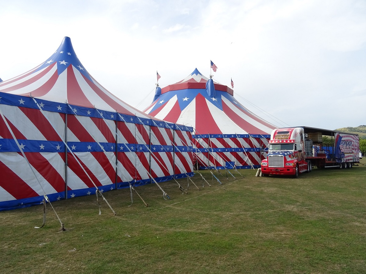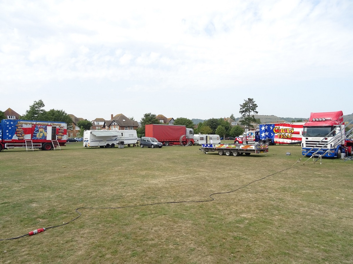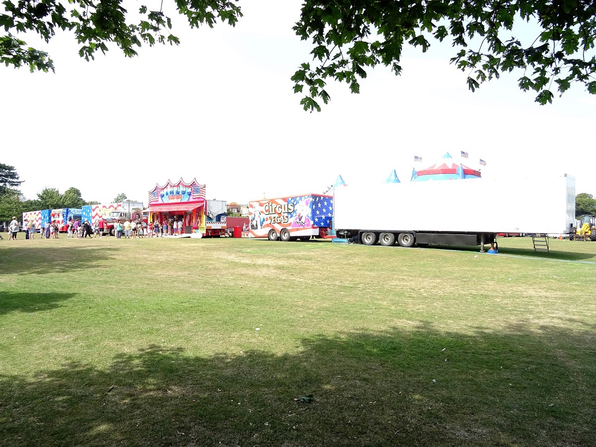 De traditionele standplaats van circussen in Folkestone is steeds Radnor park, een groot grasveld op tien minuutjes wandelen van het stadscentrum. Het circus stond ruim opgesteld en ziet er toch wat anders uit dan het standard circus (voor zover dat bestaat natuurlijk). De rood-wit gestreepte tent en voortent (met blauwe accenten) mochten er zeker zijn. De talrijke vrachtwagens vielen zeker op en hoewel voor sommigen waarschijnlijk een lust voor het oog, voor mij persoonlijk veel te druk. Onmiddellijk na de kassawagen hadden ze ook nog een kermismolentje opgebouwd voor de kleinsten. Ondanks de enorme hitte, kwam het volk massaal afgezakt om de voorstelling van 14 uur bij te wonen. Ik denk dat de tent voor zo’n 80% vol zat. Er bevonden zich ventilatoren in de tent maar het was er toch enorm heet. Desondanks zat de sfeer er goed in.