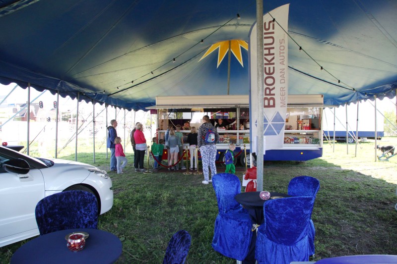 Dat zij in de regen heeft gestaan (zeker weten géén half uur, dat is sterk overdreven), heeft te maken met de onvoorspelbaarheid van het Nederlandse weer: aangezien het de laatste voorstellingsdag was, was het tentdak boven de kassawagen al weggehaald. Bijgaand een foto waarop te zien is hoe het er de voorgaande voorstellingen uitzag in Hengelo: ruimte voor praktisch alle bezoekers, en gezellige zitjes die netjes verzorgd zijn. En daar is dan die tweede dame in de wagen voor: het verzorgen van de drankjes, popcorn en dergelijke.